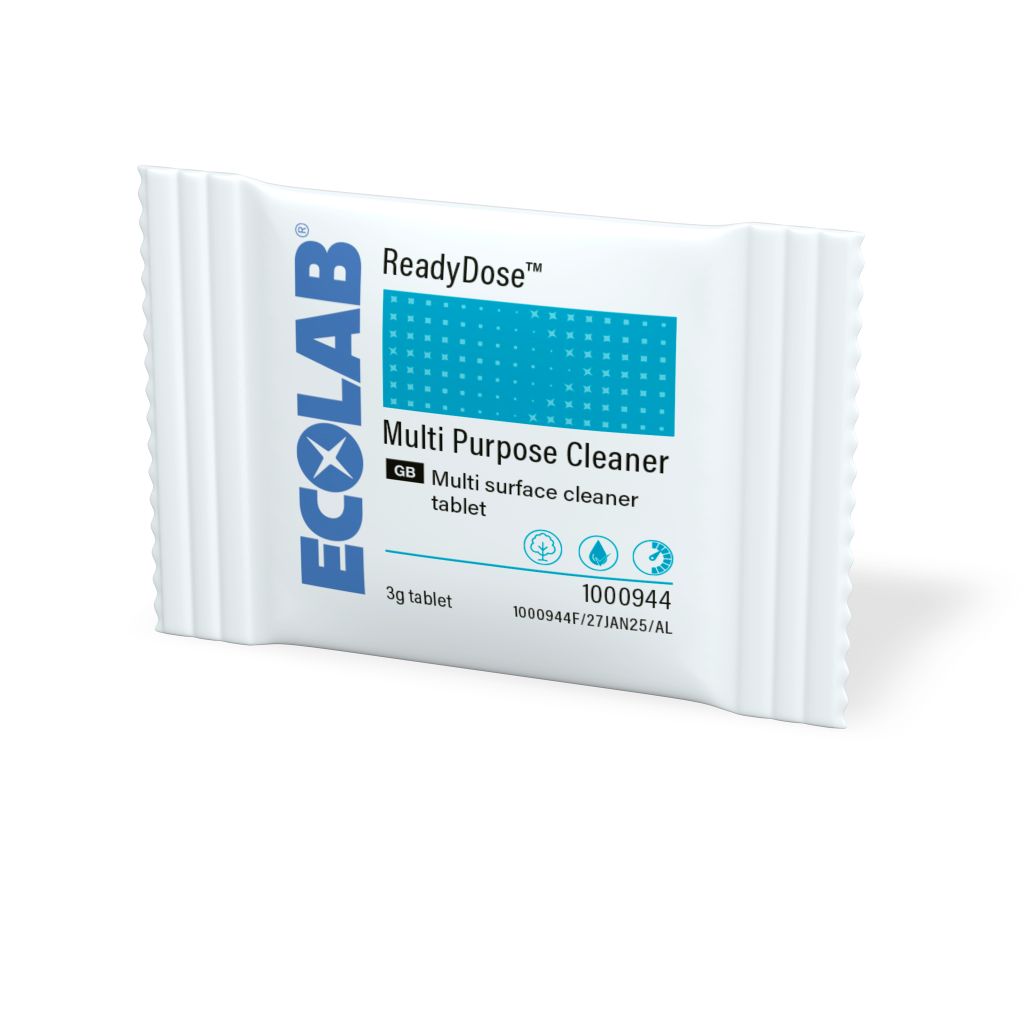 Met ReadyDose heeft Ecolab een nieuwe productrange ontwikkeld voor de dagelijkse reiniging van alle oppervlakken in de Horeca, kantines en andere aanverwante bedrijven. Zoals bijvoorbeeld de Ecolab ReadyDose Multi-Purpose Cleaner Tabs. Alle ReadyDose producten zijn gemakkelijk te gebruiken met een goede reinigende werking en glanzende oppervlakken en met altijd de juiste dosering. Ook zijn de tabletten makkelijk te verplaatsen en ze nemen zeer weinig opslagruimte in.