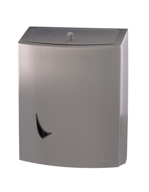 Klein afsluitbaar Wings afvalbakje van RVS met optilbare deksel en een inhoud van 9 ltr. Deze RVS afvalbak is geschikt voor wandmontage en heeft een RVS muurplaat. Alle Wings RVS dispensers zijn voorzien van een anti-fingerprint coating waardoor je geen vlekken en strepen op het RVS krijgt, en met 5 jaar garantie. De Wings RVS dispensers blijven op deze manier mooi tijdens het gebruik.