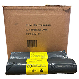 De meest gebruikte vuilniszak in Nederland: De grijze KOMO zak! Deze sterke LDPE afvalzak met een dikte van 55 my heeft een afmeting van 60x80 cm en een inhoud van 60 liter. De draagkracht van een KOMO afvalzak is ongeveer 12 kg. Deze vuilniszak is geproduceerd volgens het officiële KIWA productcertificaat BRL 9901. Wij leveren de KOMO zakken in dozen van 20 rollen, elke rol van 20 stuks is apart verpakt en voorzien van een set sluitstrips.