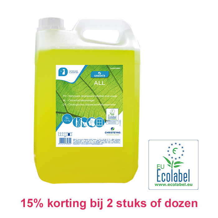 GREEN'R All Allesreiniger van Christeyns is een niet schuimende ontvettende Ecolabel allesreiniger voor vloeren en alle overige waterbestendige oppervlakken. GREEN'R All Allesreiniger is te gebruiken voor minerale en organische vetten en droogt streeploos op. De allesreiniger werkt snel, zorgt voor mooie glanzende oppervlakken en heeft een heerlijk zachte frisse grapefruit geur. Het kan ook gebruikt worden in plaatsen waar voedsel wordt bereid en in schrobzuigmachines. GREEN'R All Allesreiniger is voorzien van het EU Ecolabel.