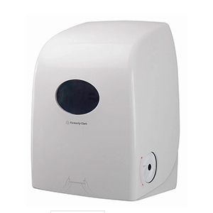 Kimberly-Clark Aquarius rolhanddoek dispenser van brand- en slagwerend ABS wit kunststof. Afsluitbaar met verborgen slot zonder sleutel. Past bij handdoekrol 27506 en 27507