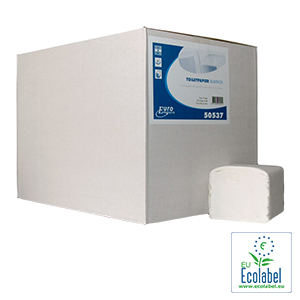 Toiletpapier Bulkpak losse vellen tissue wit draagt het EU Ecolabel en het PEFC logo: dit papier komt uit duurzaam beheerde bossen.