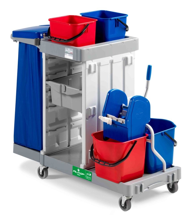 Werkwagen Alpha 1 bestaat uit een basis met 4 wenkwielen. De werkwagen wordt geleverd met 2 emmers van 15 liter met een kunststofpers voor vlakmoppen, 2 emmers van 12 liter, een kunststof lade en een 120 ltr afvalzakhouder met deksel. Werkwagen Alpha 1 heeft een ergonomische werkhoogte.